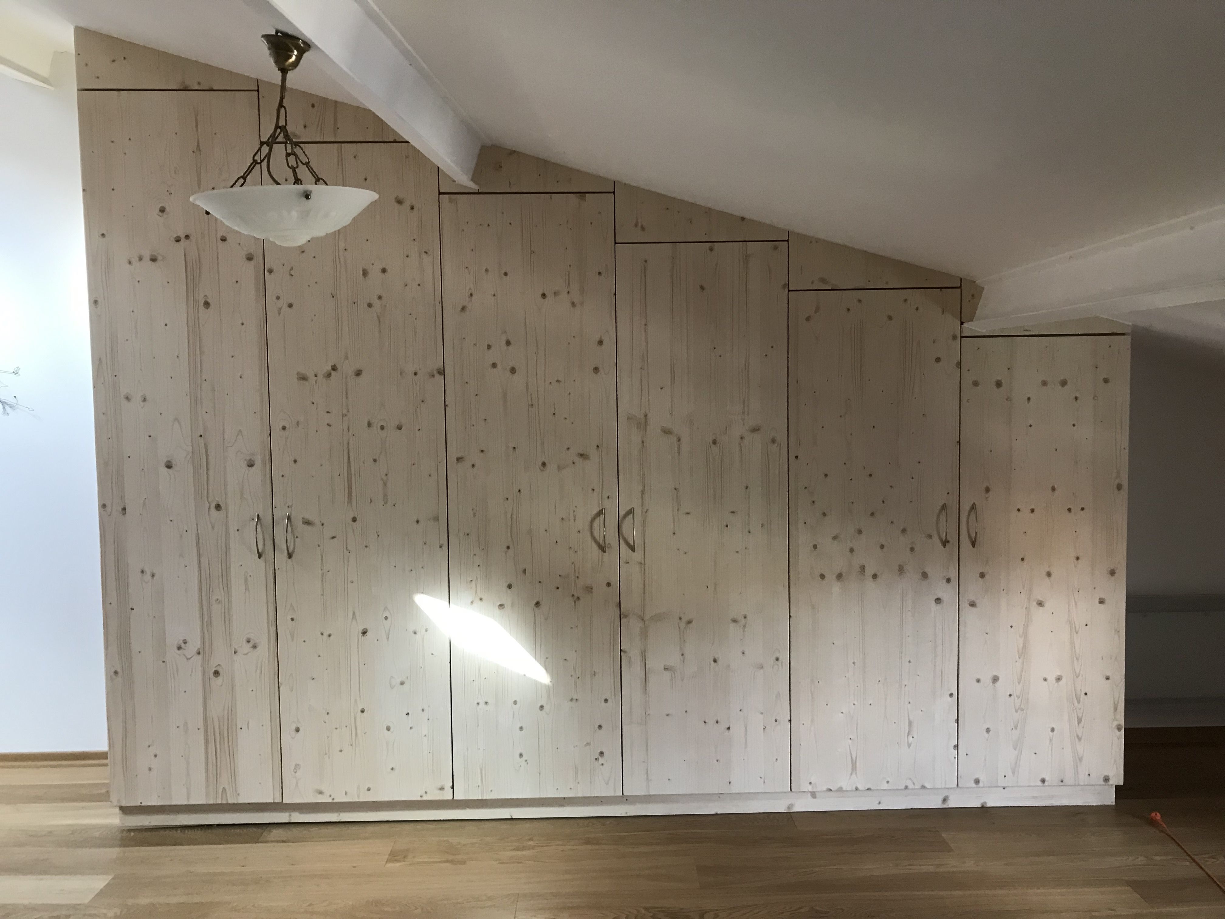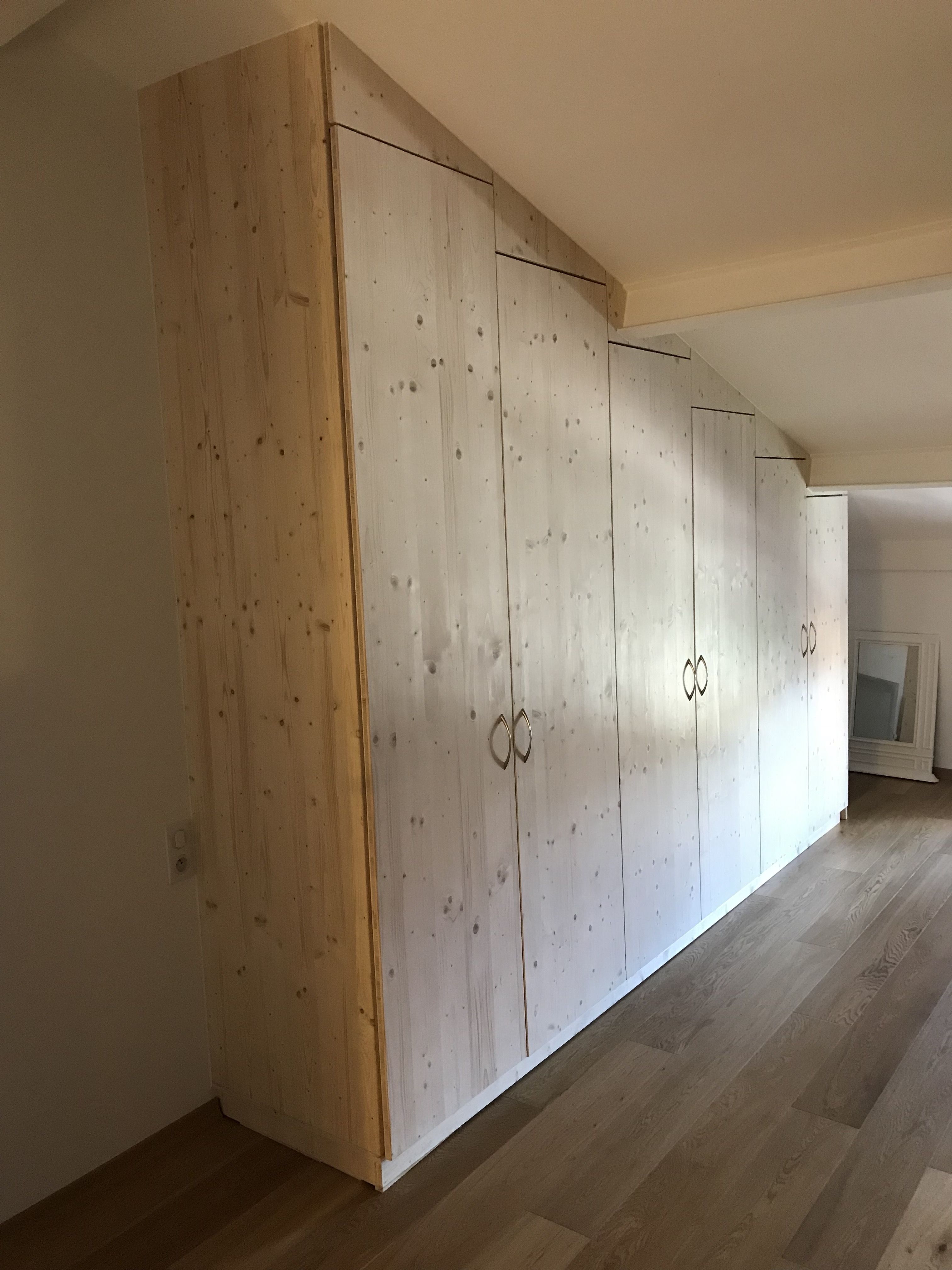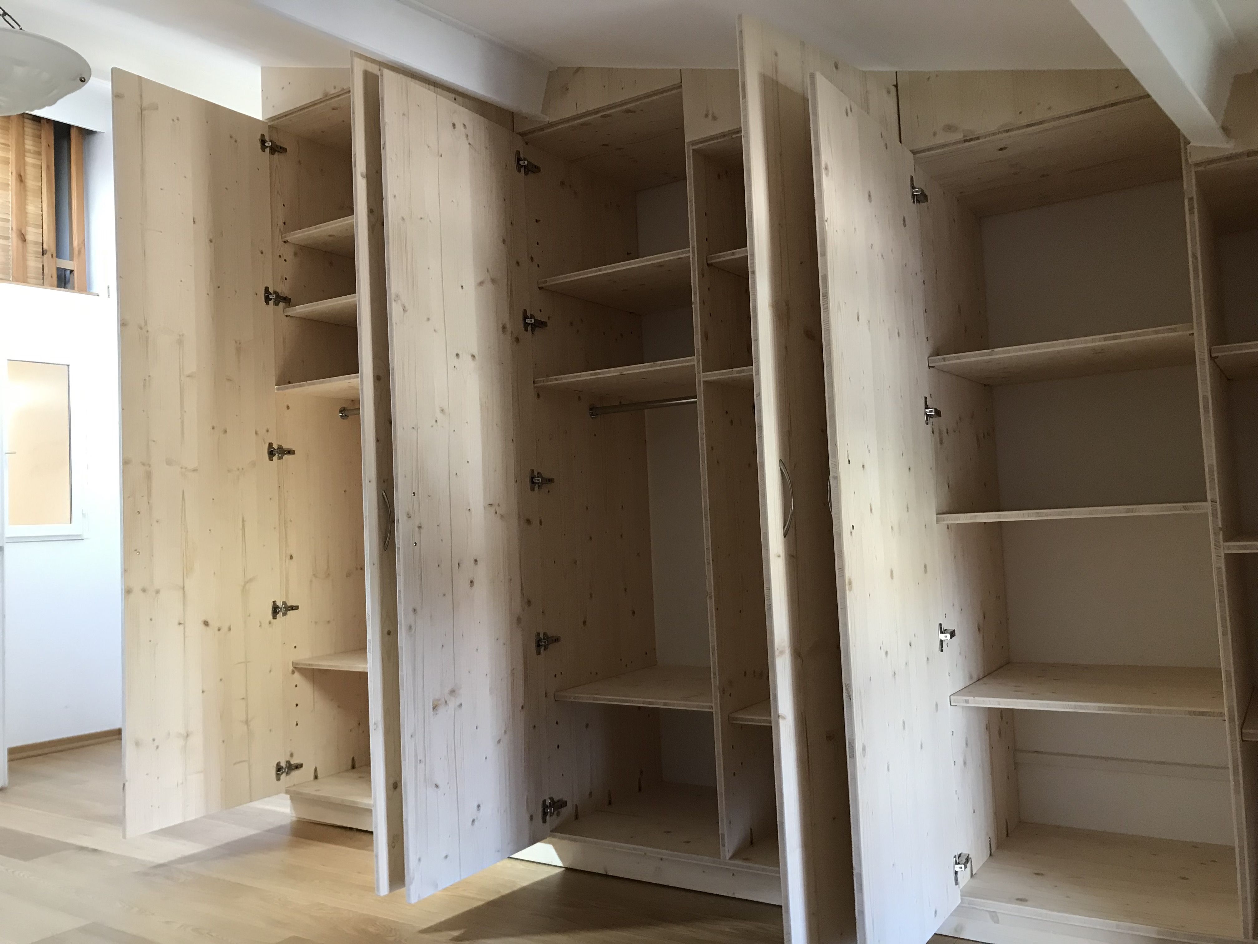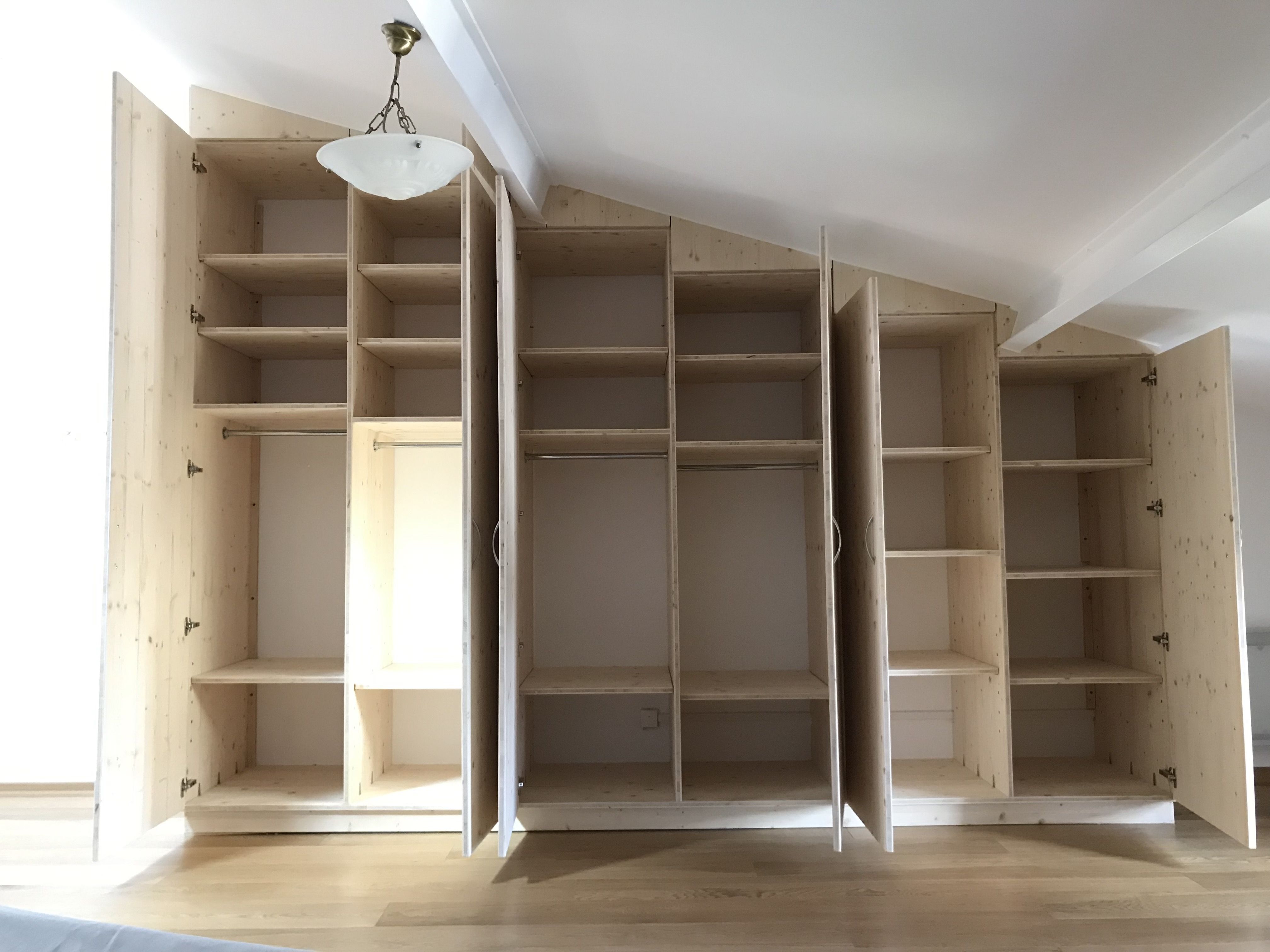 Un placard en 3pli fabriqué en 6 sections avec tringles et étagères modulables installé chez le client et adapté aux murs et plafond.