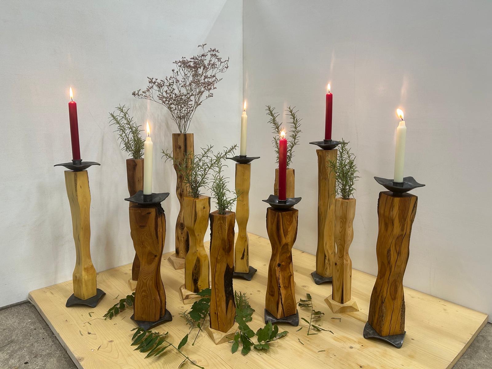 Soliflores et porte bougies taillés de differences essences de bois