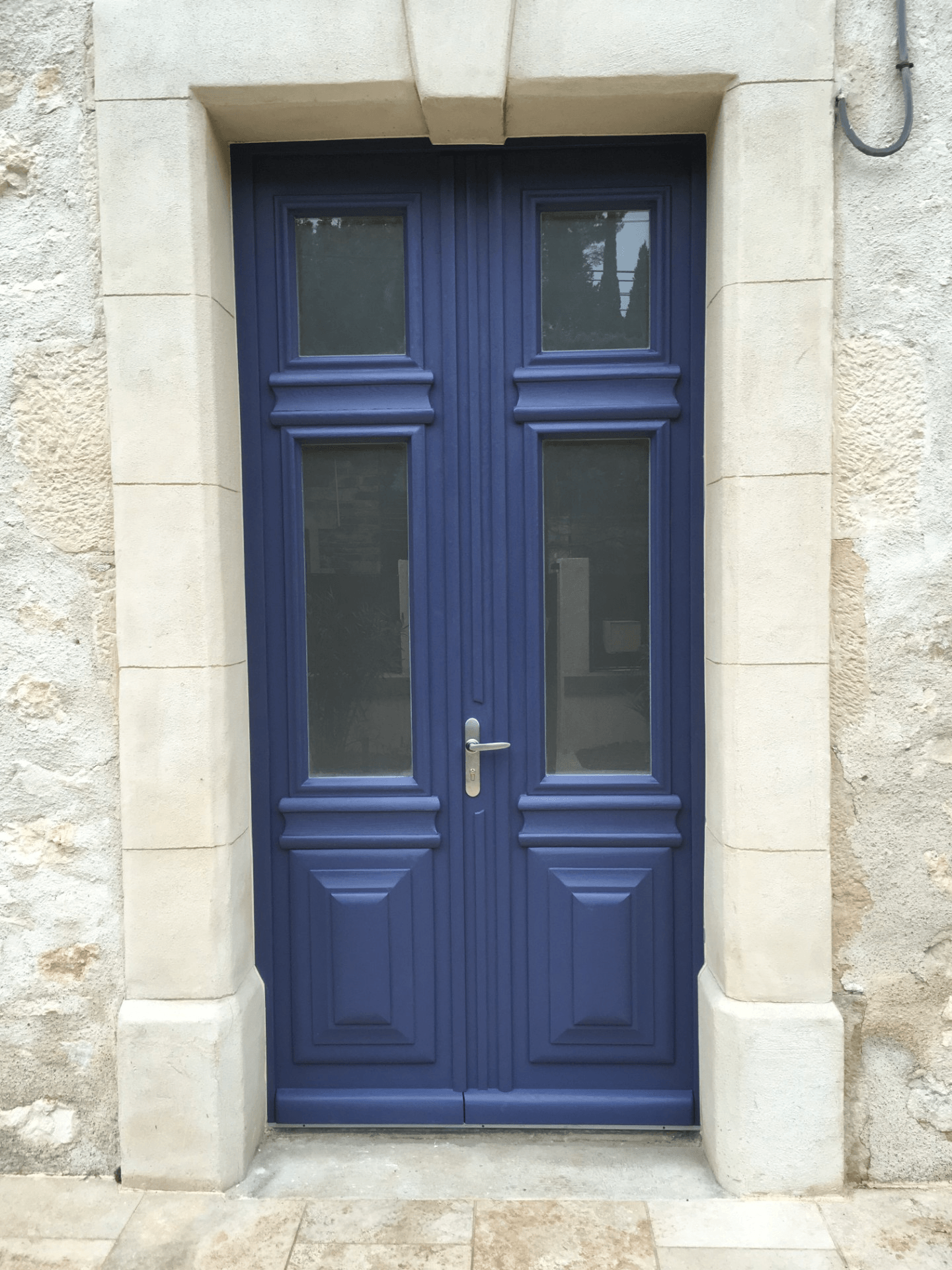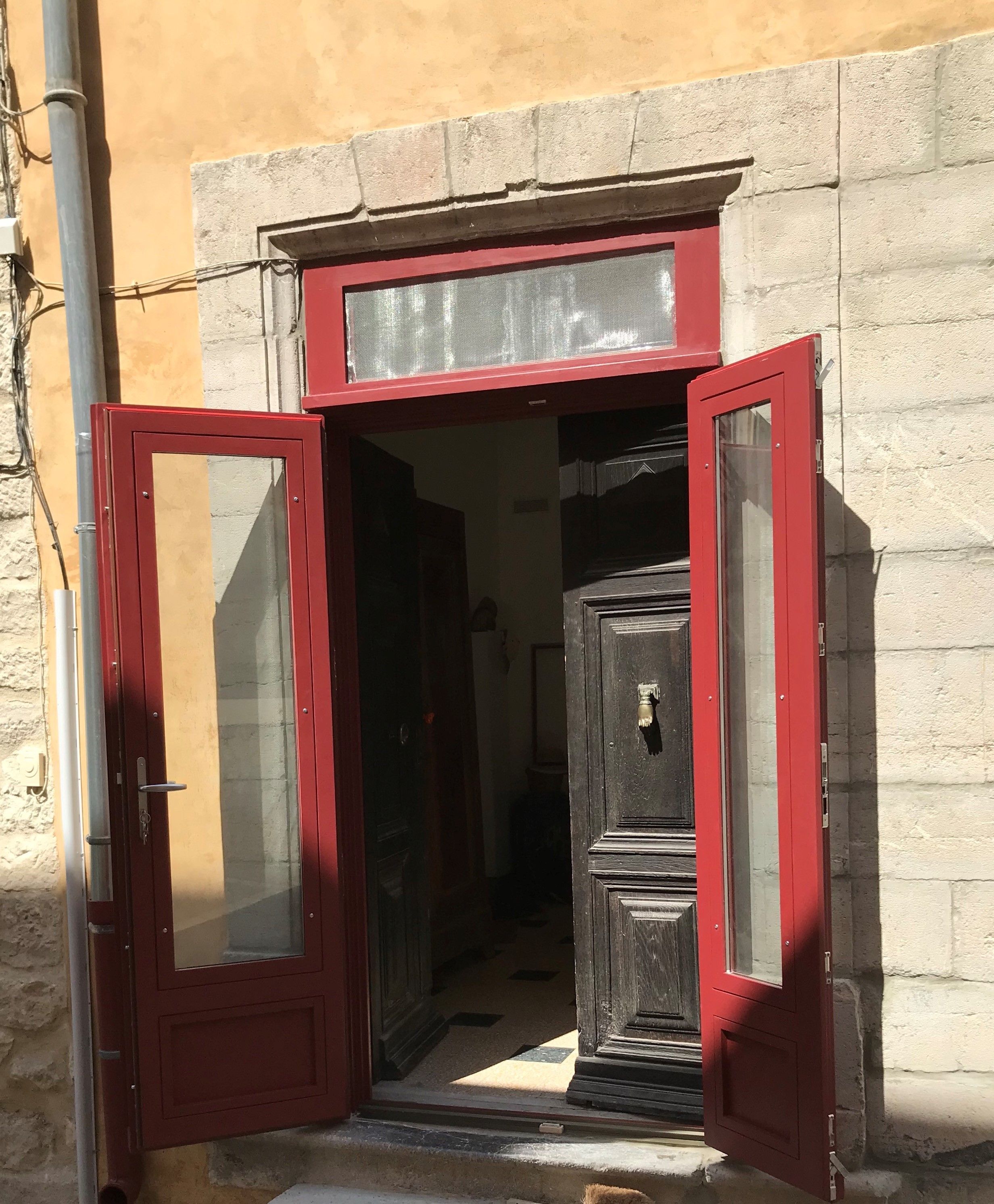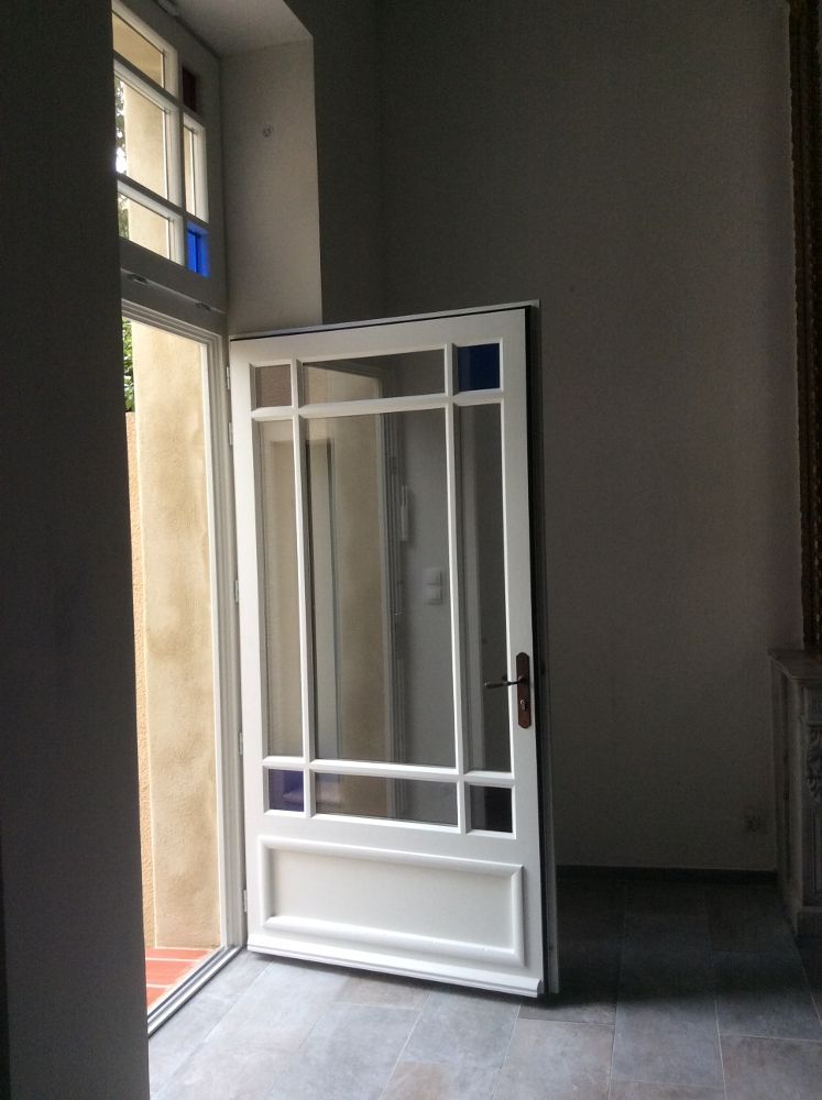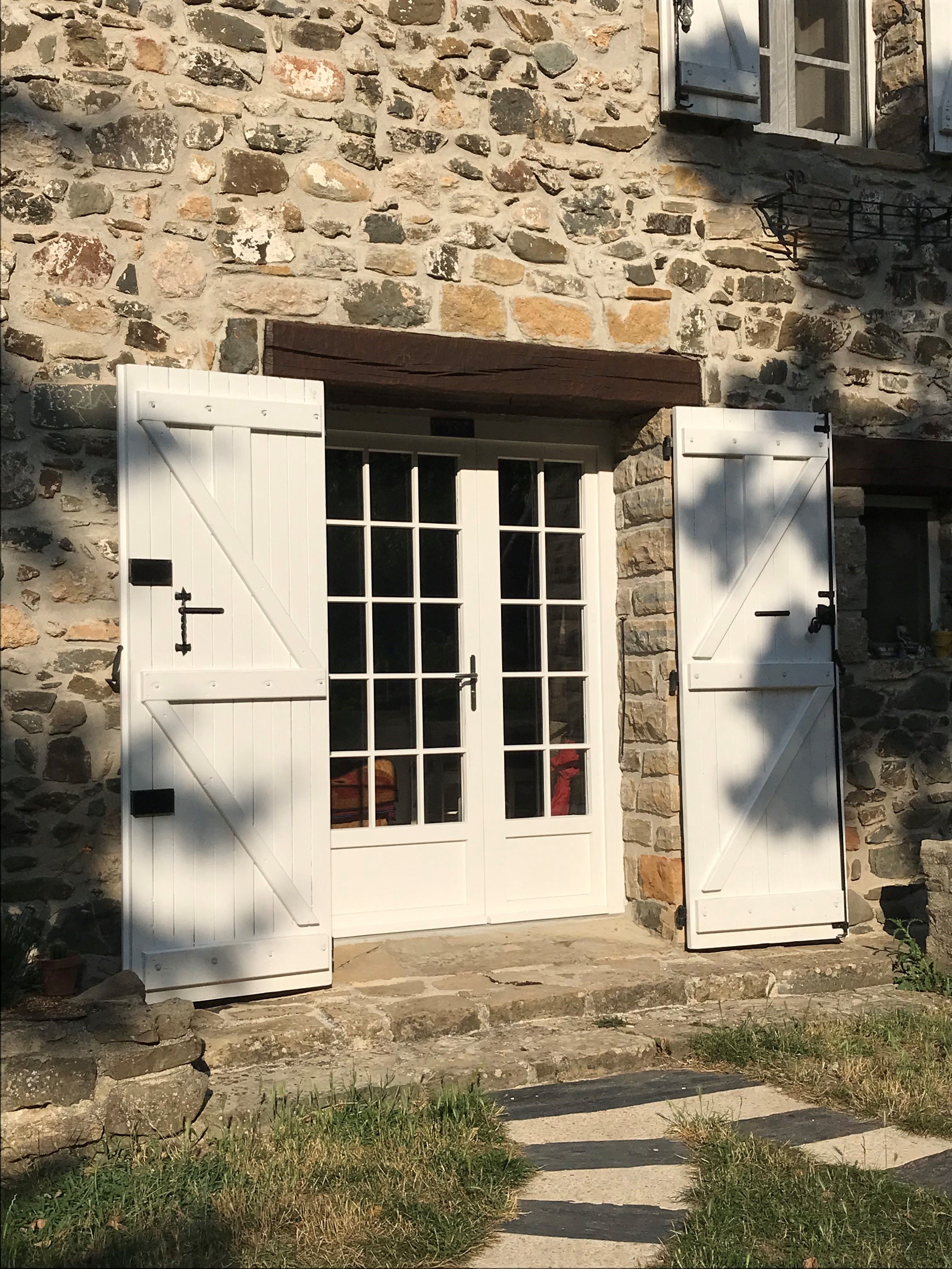 - Porte d’entrée vitrée avec petit bois assortis au style de la maison en pierre.