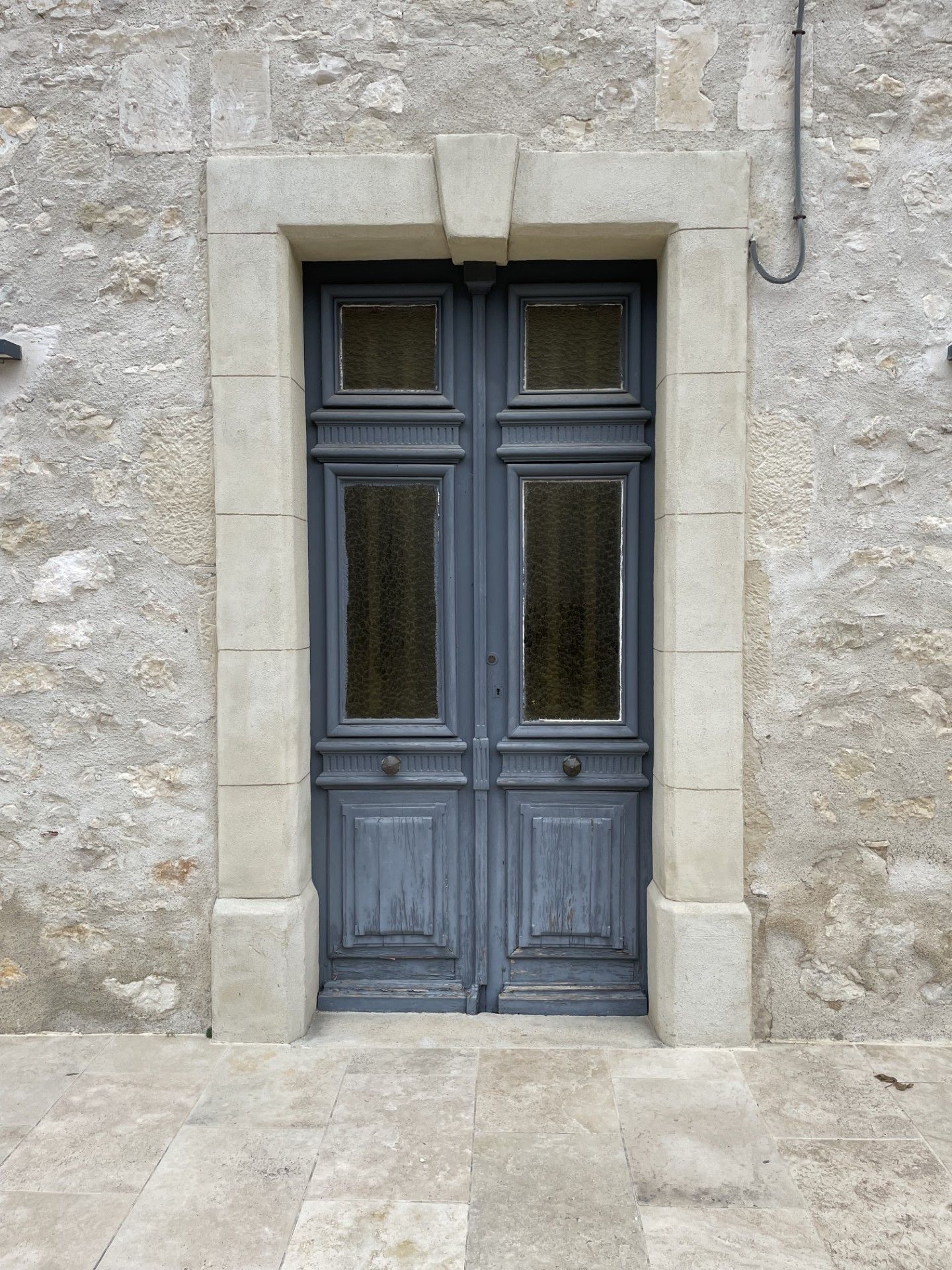 Porte d’entrée vitrée avec petit bois assortis au style de la maison en pierre.