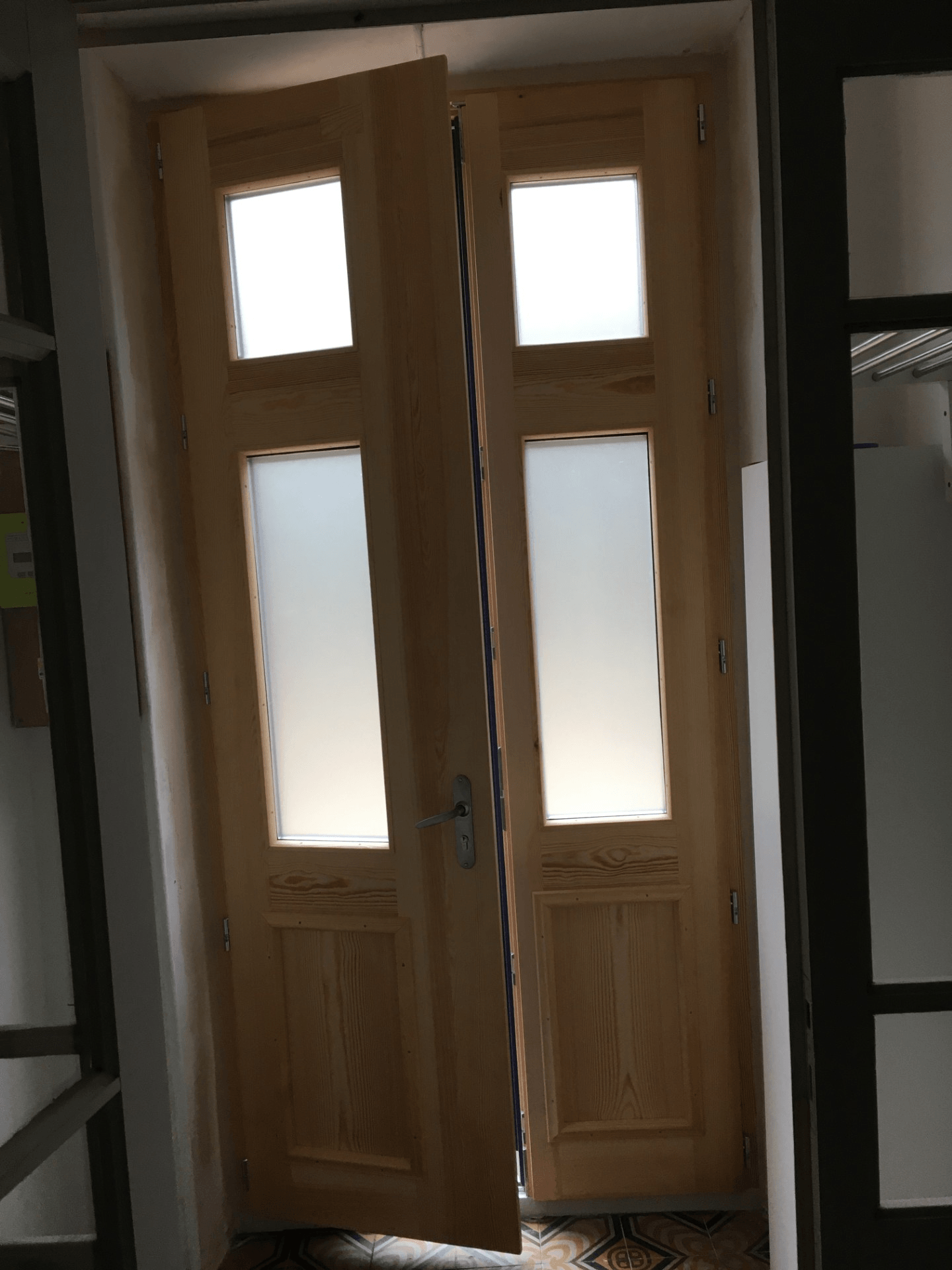 porte cintrée avec 2 vantaux en bois de pin sylvestre, peinte par le client.
